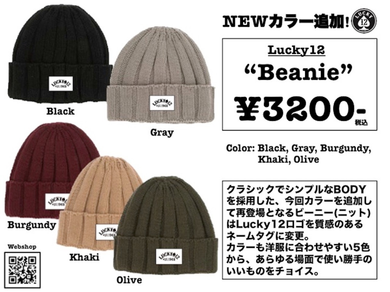 クラシックでシンプルなBodyを採用し、前回にリリースから久しぶりの登場となるビーニー(ニット帽)も定番のLucky12ネームタグは健在。